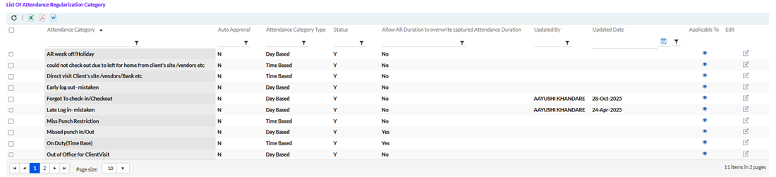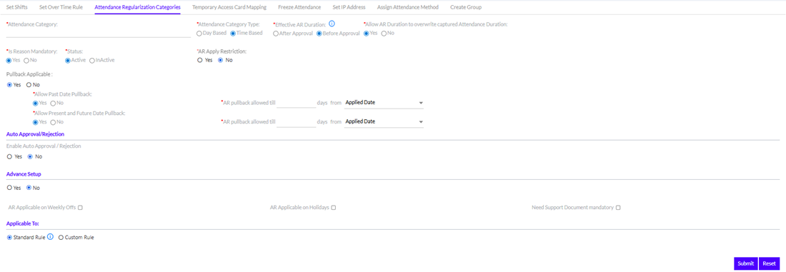 If by mistake an issue is faced by the employee or he/she forgets to check-in/checkout, there is an option to raise for Attendance Regularization (AR)by the employee, which if approved by the manager, regularizes the attendance for that period. Here admin should add Fill up the Attendance category. Admin has to select Pull Back Applicable Yes/No. If Yes other rules like Allow Past date pullback Yes/No, if Yes - AR pullback allowed till Allow AR pullback allowed till how many days from Applied Date/Leave Date/Approved Date can be Set (ideally 365 days). Admin can Allow Present and Future Date Pullback similarly.