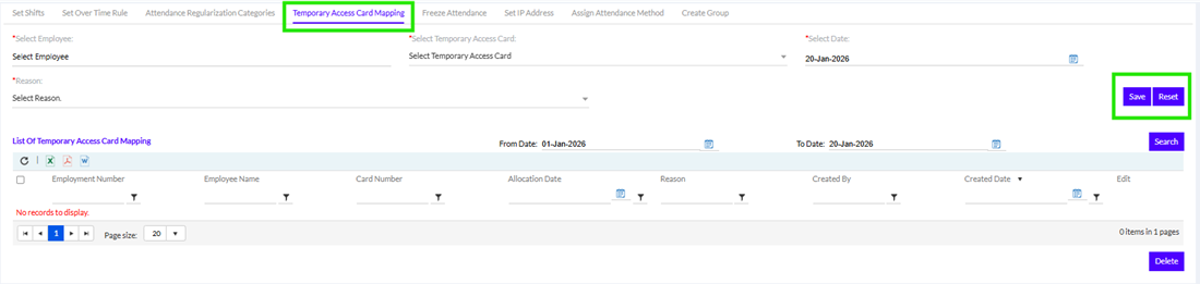 When employee forgets to bring their access card, they can be temporarily assigned one access card, which needs to be mapped for attendance purpose. Here admin should Select Employee, Select Temporary Access Card, Select Date and Select Reason.