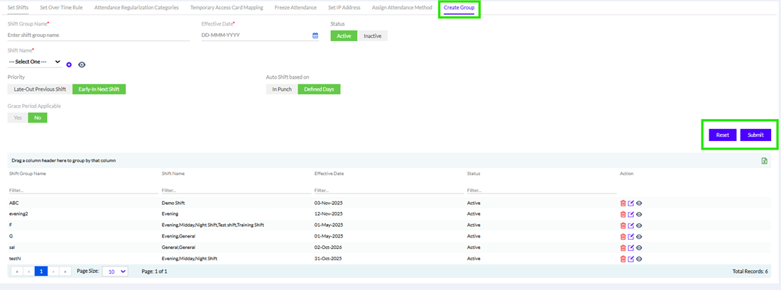 Enter the Shift Group Name, Effective Date and select the Status Active/Inactive, select the Shift Name from the drop down. Select the Priority (Late Out Previous Shift/ Early In Next Shift) and Auto Shift based on (In Punch/Defined Days) and Grace Period Applicable (Yes/No) and click on Submit. Previously created groups are displayed below and can be exported in excel format.