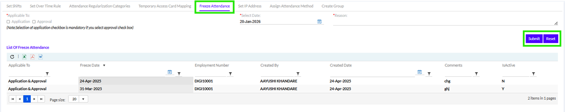 The Attendance of the employees can be freezed after certain dates for payroll purpose. Here admin should add Applicable to- Application/Approval-both can be selected, Select Date and give Reason.