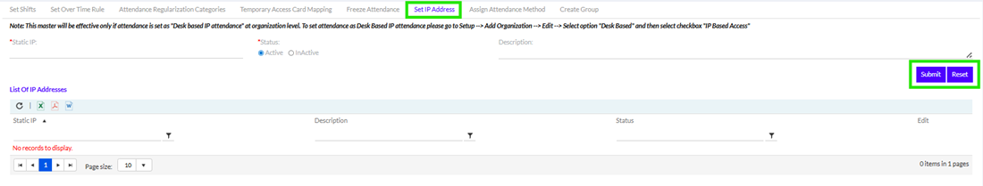 The Admin then clicks Submit to Set IP Address. List of IP Addresses that are previously created are displayed below. Admin can also extract the data in Excel, PDF or Word Format. The records can be edited by the admin.
