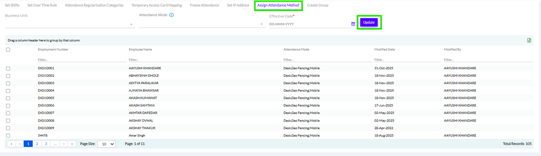 Select the Business Unit from the drop down, select the Attendance Mode, and set the Effective Date from which the attendance Mode will be applied and click Update.