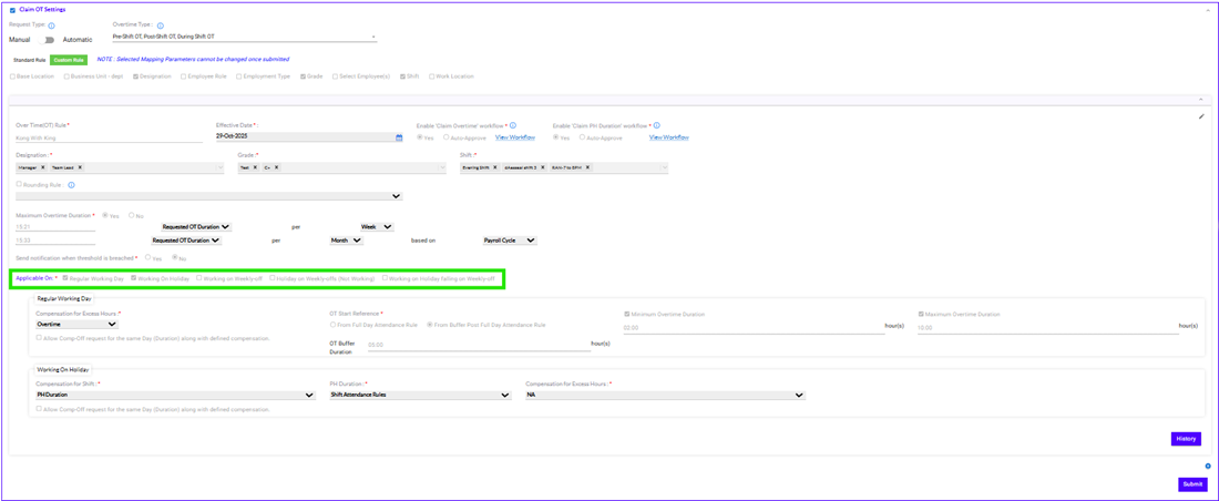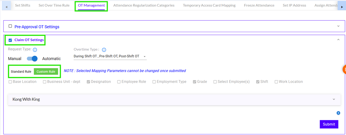 In claim OT settings an User gets an option to select over time rule like pre-shift OT, duration shift OT and post shift OT. The user can add shift or give OT depending upon the base location, business unit, designation, employee role, employee type, grade, select emplyoee’s, shift and work location. There are two rules under this, one is standard rule and custom rule. If standard rule is selected, then it will be applicable to all shift types.