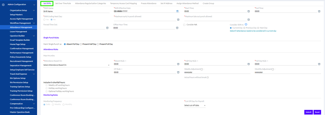 Here admin can add Shift Name, Attendance Regularization Categories, Shift Effective Date, Start Time, End Time, Shift Ending Next Day- Yes/No, Maximum early in Punch allowed, Maximum late out Punch allowed.