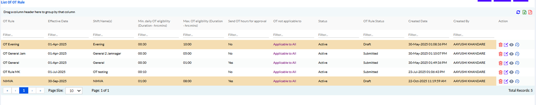 The Admin creates a Over Time (OT) Rule by entering OT rule name, Effective Date (after the latest attendance freeze date), Select Shift (s) (here multiple shifts can be selected, the shifts are previously created in set shifts). If “Send OT hours for Approval” is Yes then - OT hours of employees will be sent for approval as per the defined workflow and will contribute in attendance once approved by approver; if set no then - OT hours of employees will contribute in attendance without any approval.