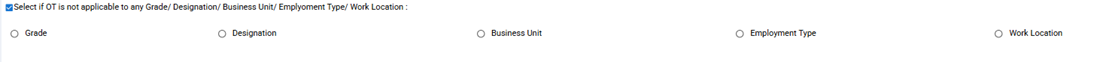 The admin can click box for “Select if OT is not applicable to any Grade/ Designation/ Business Unit/ Employment Type/ Work Location”.
