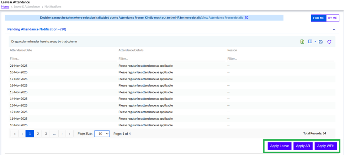 Under For Me, Manager/HR/Employees will find requests pending for them to initiate their attendance regularization/apply leave/apply work from home as per the organization attendance policy as shown below. If you click on Apply Leave, it will direct you to your leave page. If you click on Apply AR, it will direct you to your Attendance Regularization page & if you click on Apply WFH, it will direct you to your Work From Home page, as highlighted in the screenshot below.