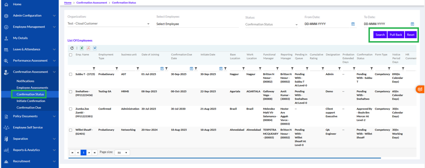 This tab showcases the list of Confirmation Assessments submitted by the members of the team, along with the status of the request and other details. This is visible to the Managers and Admin &HR, who have employees reporting to them and Admin/HR.