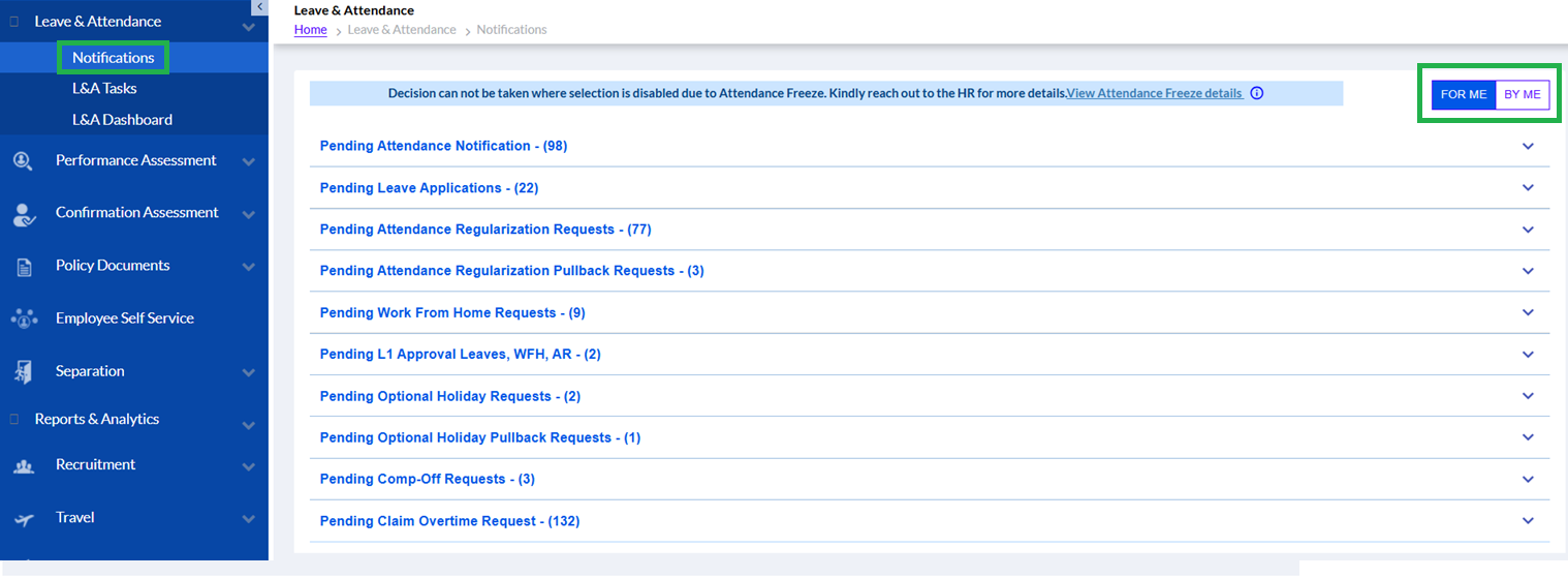 The Notification section shows a list of notifications related to attendance notifications, leave, attendance regularization, pullback, work-from-home requests, optional holiday requests, comp-off requests, OT requests, approvals and more. There are two sections under this tab i.e., For Me & By Me.