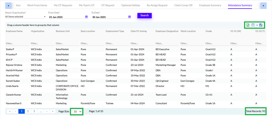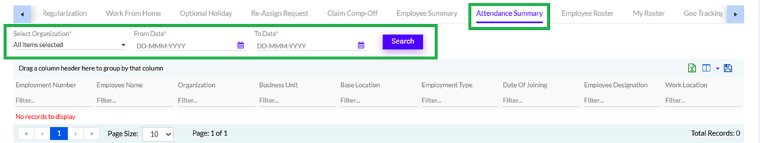 This tab is visible to the admins and managers, depending on the permissions given to them in the Admin Set up. After clicking Attendance Summary, below screen is displayed. Here Managers/HR can select the organization and the date range to search all the attendance details of that period as shown in the screenshot below.