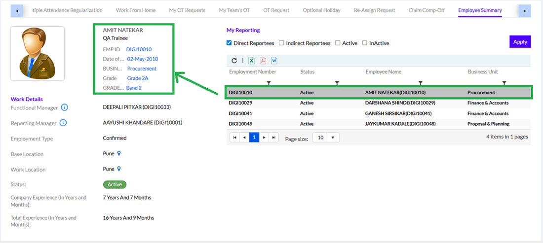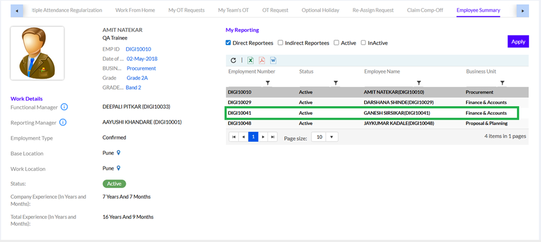 On this page, the employees can see their work details on the left side. The organization tab is visible as per Global Access rights. HR/Admin only to manage/update employee leave & attendance details of different locations. For others My Reporting is visible only. The Active/Inactive tab is visible as per the configuration made in the Access Rights Management section under the Admin Configuration.