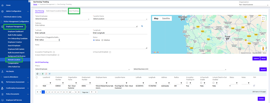 This is for Managers and HRs to track the geo location of employees who are at client site. The HR can set the master for geo-tracking in the employee management Remote Location Menu Employee Management>Remote Location>Geo-Tracking. Select the Geo-Tracking tab. Then select the employee from dropdown menu, Select Status- Active/Inactive, set the Tracking Interval (minutes).