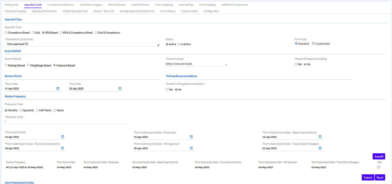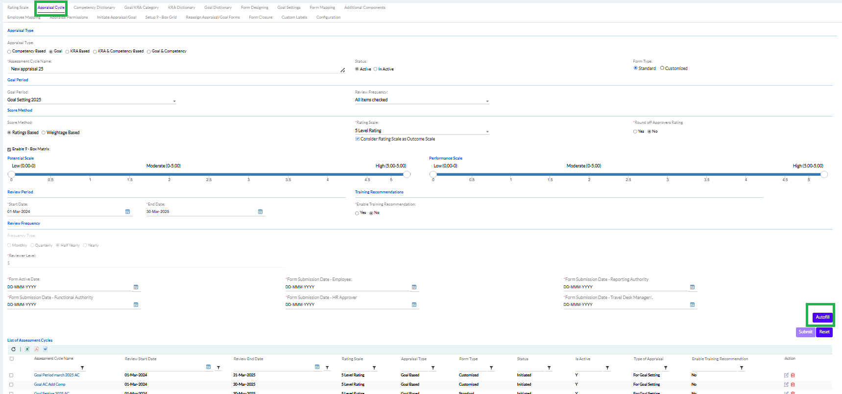 The Admin needs to fill up by Filling up the Assessment Cycle Name, Select the Active/In Active and Form Type (Standard/Customized), Score Method, Start Date, End Date, and select Rating Scale from the Dropdown. Then Click on Autofill to generate data and Submit.
