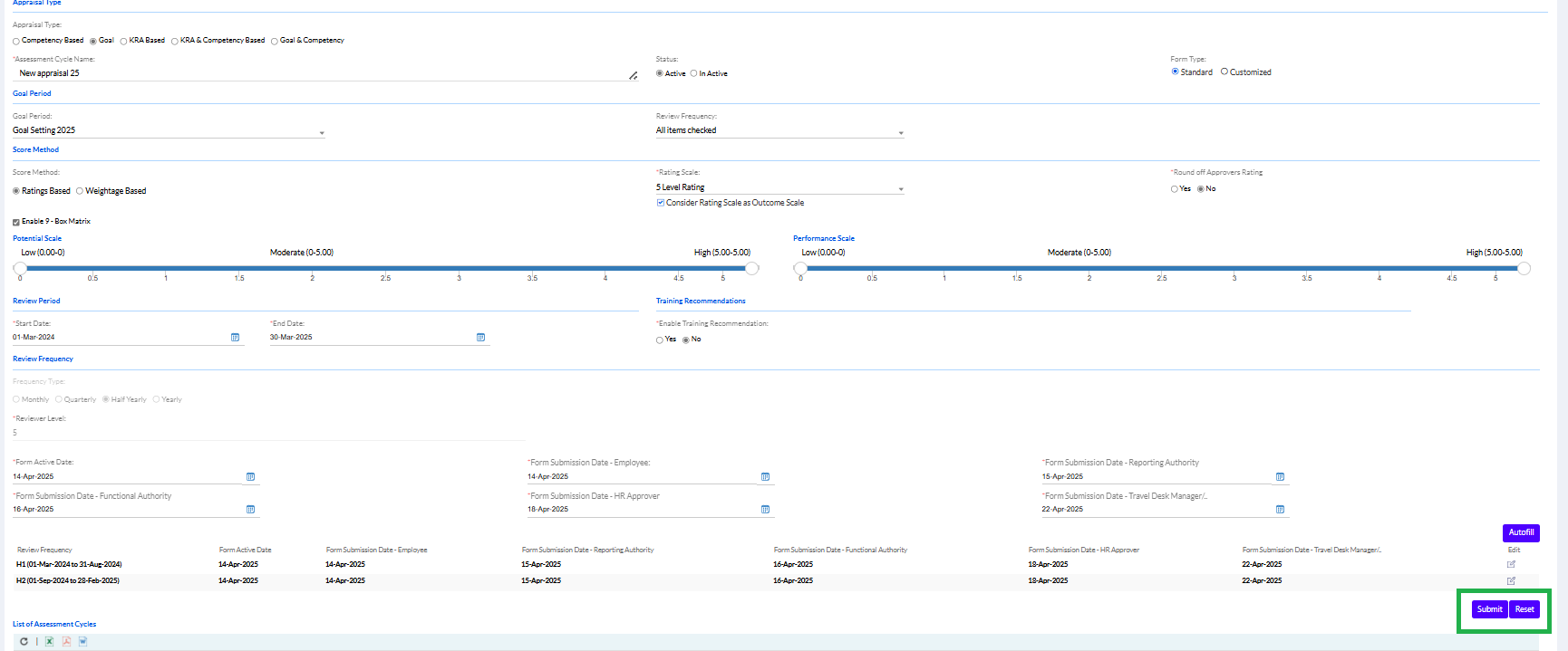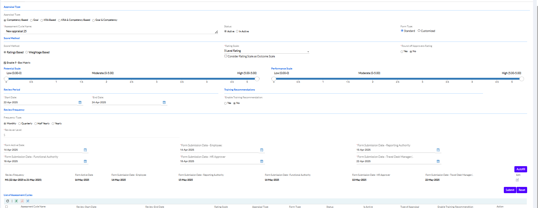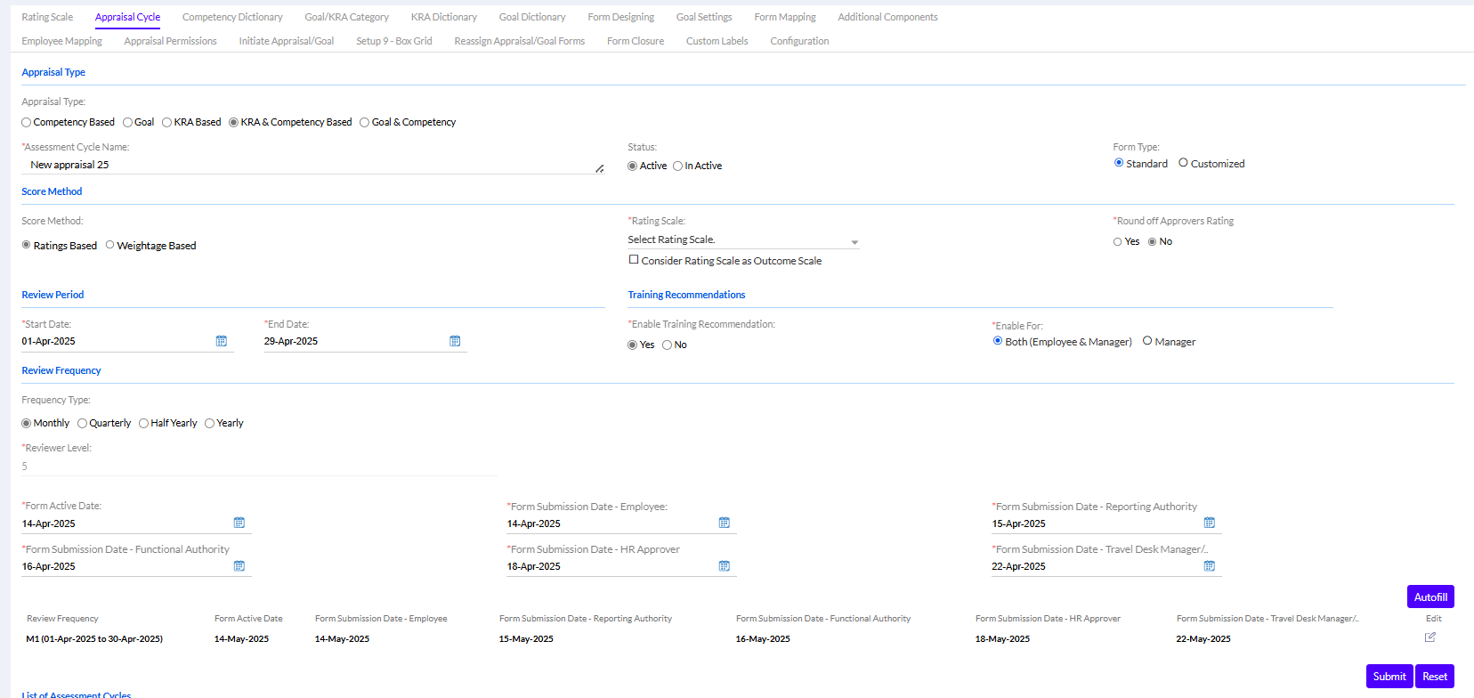 The Admin needs to filled up by Filling up the Assessment Cycle Name, Select the Active/In Active and Form Type (Standard/Customized), Score Method, Start Date, End Date and select Rating Scale from the Dropdown. Then Click on Autofill to generate data and Submit.