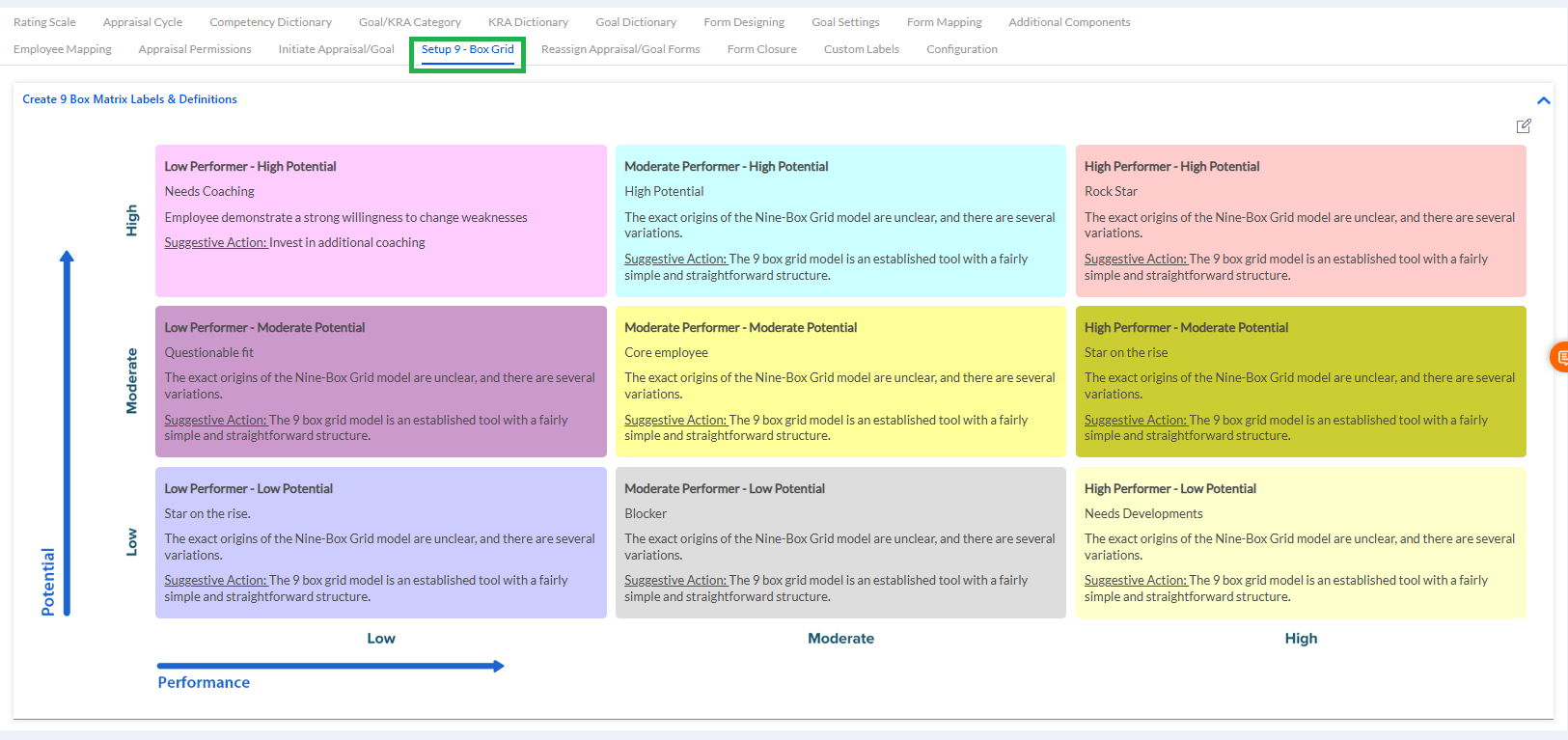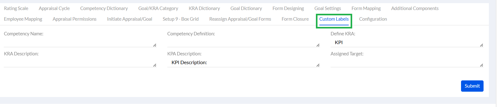 Add Labels to various competencies and Goals here. These are actually for companies who want to customize particular names for columns according to their norms. It will be changed in all the forms throughout the organization.