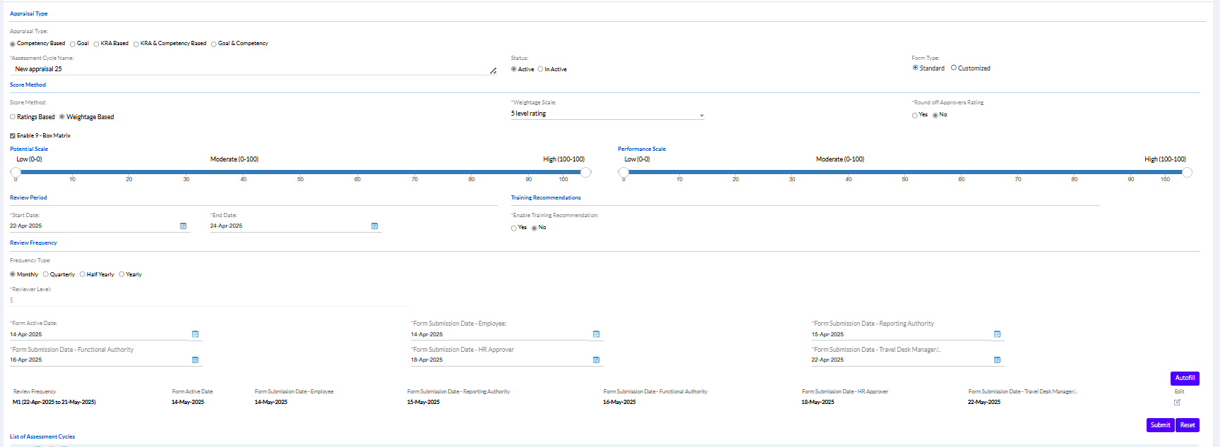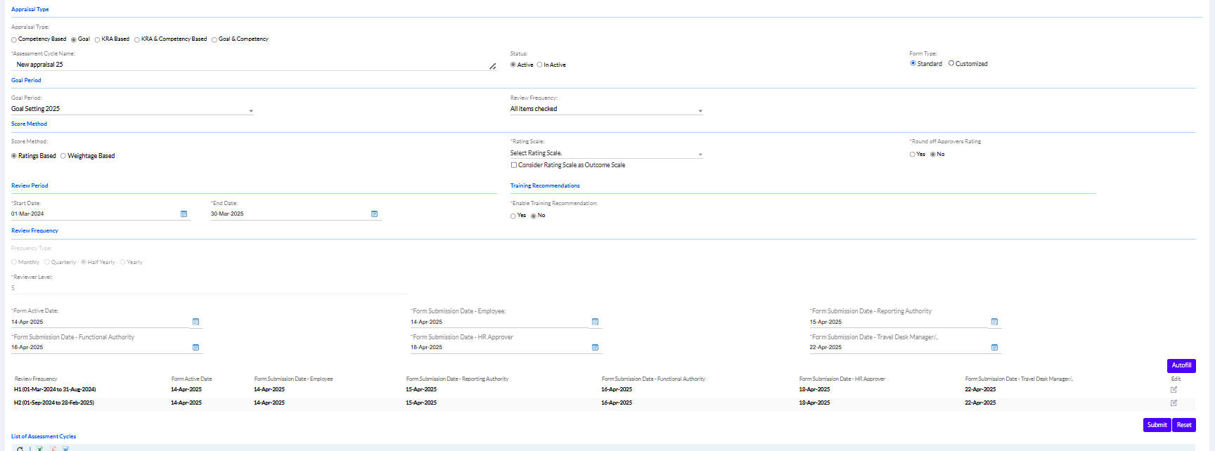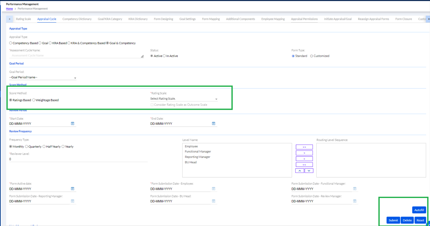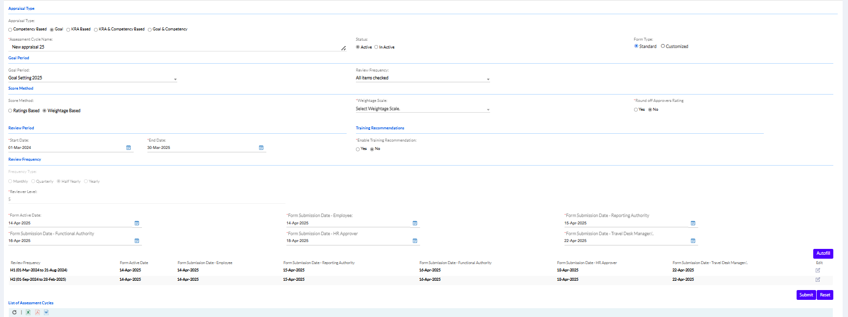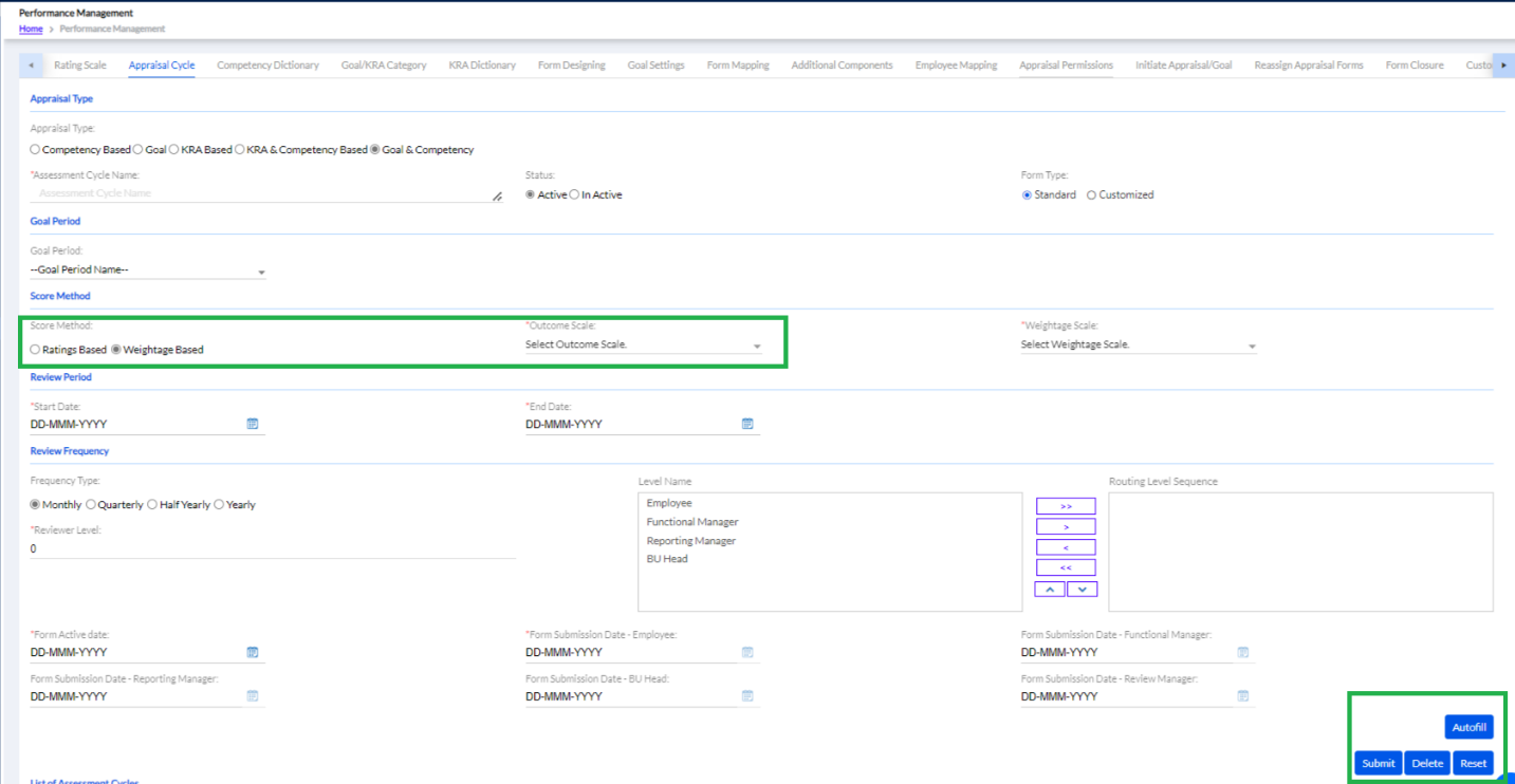 The Admin needs to fill up by Filling up the Assessment Cycle Name. Select the Active/In Active and Form Type (Standard/Customized), Goal Period, Score Method, Start Date, End Date, and select Weightage Scale from the Dropdown. Then Click on Autofill to generate data and Submit.