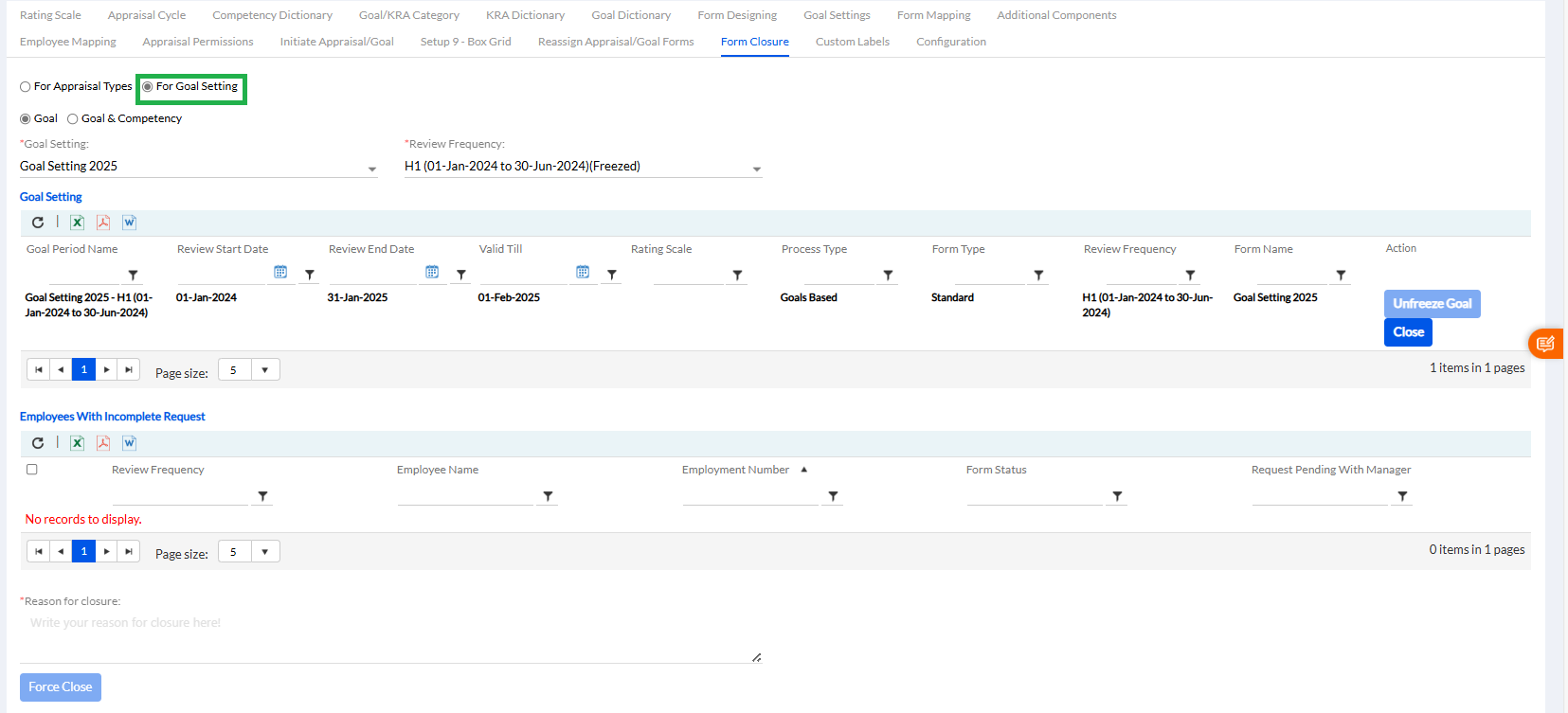 Goal Based Appraisal cycle is created by selecting the desired freezed Goal Period.