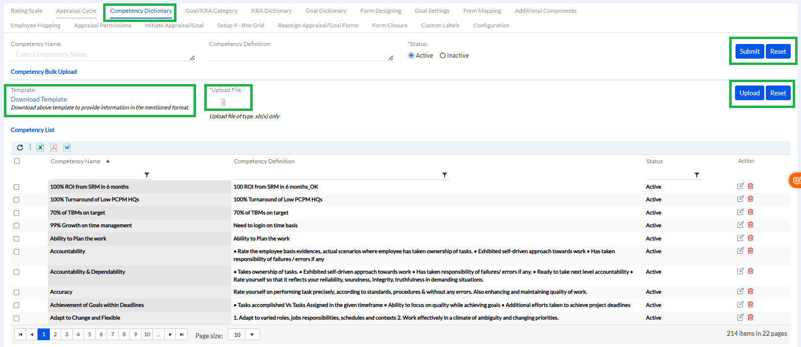 Admin can Create Competencies, Competency Definitions, etc. Admin can also upload Competency Dictionary through Excel Template. Admin can search competencies to add in the form from the list of Competencies based on the status/competency name.