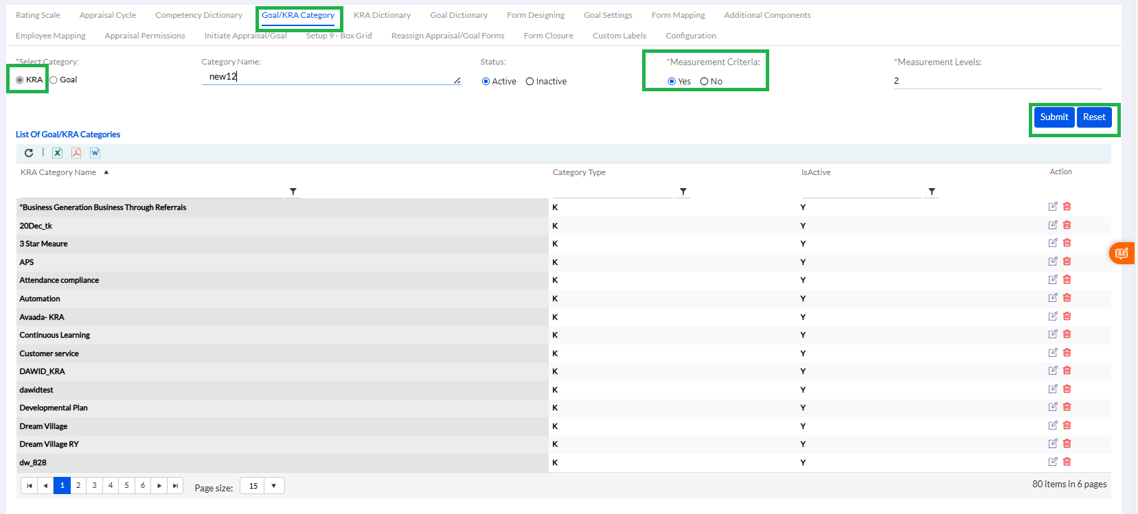 Click Submit (as highlighted in the above screen) to create a new KRA Category.
