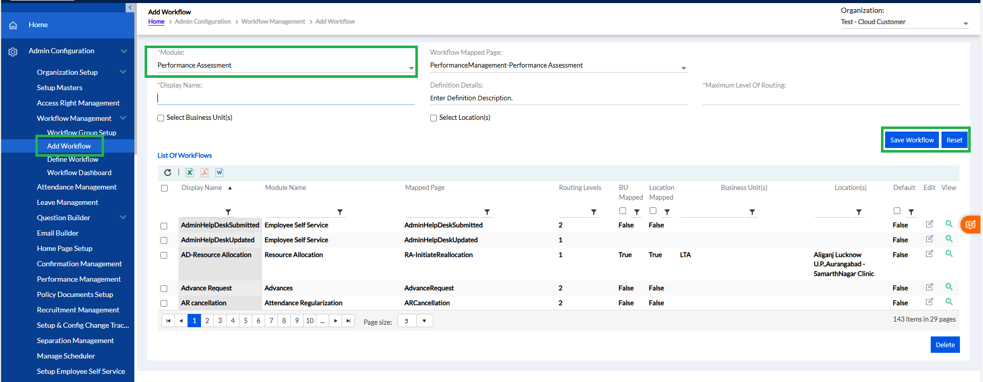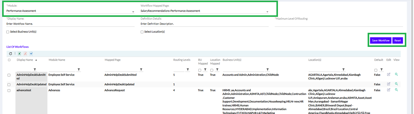 The workflow can be added here for the selected modules like the Performance Assessment module here.