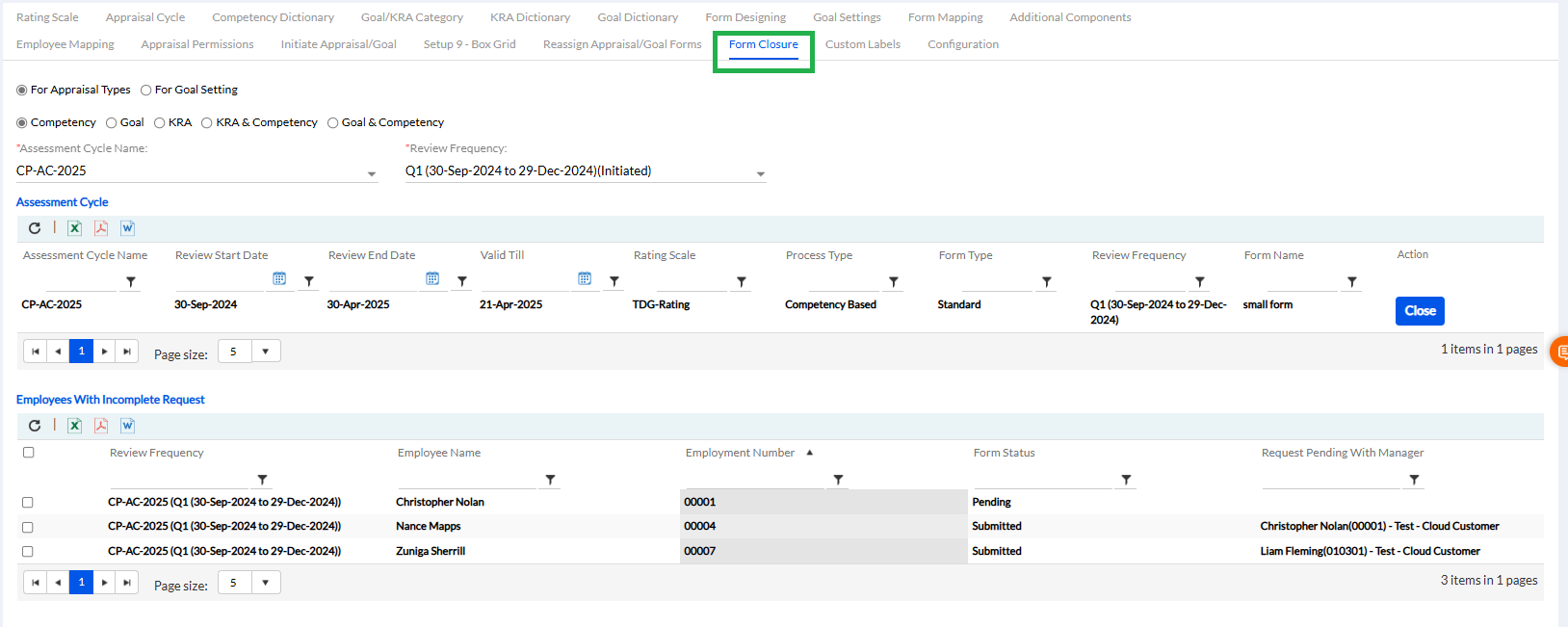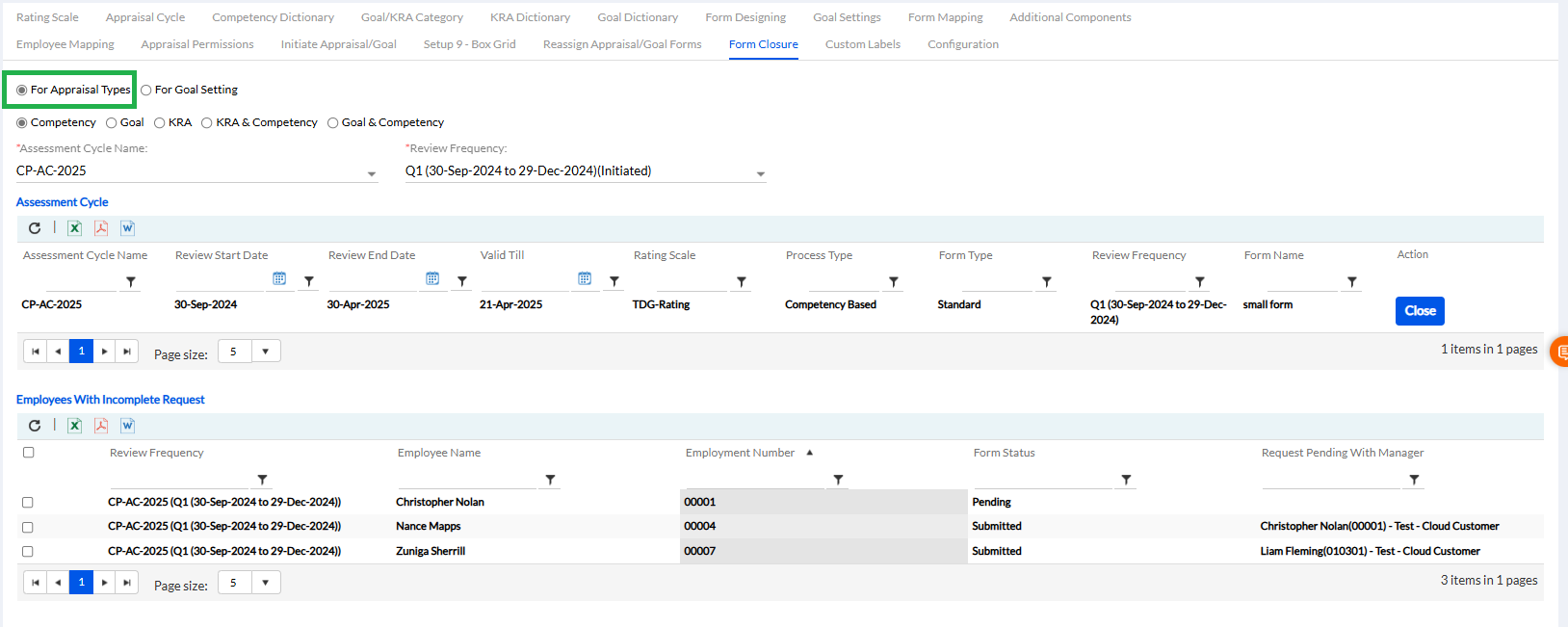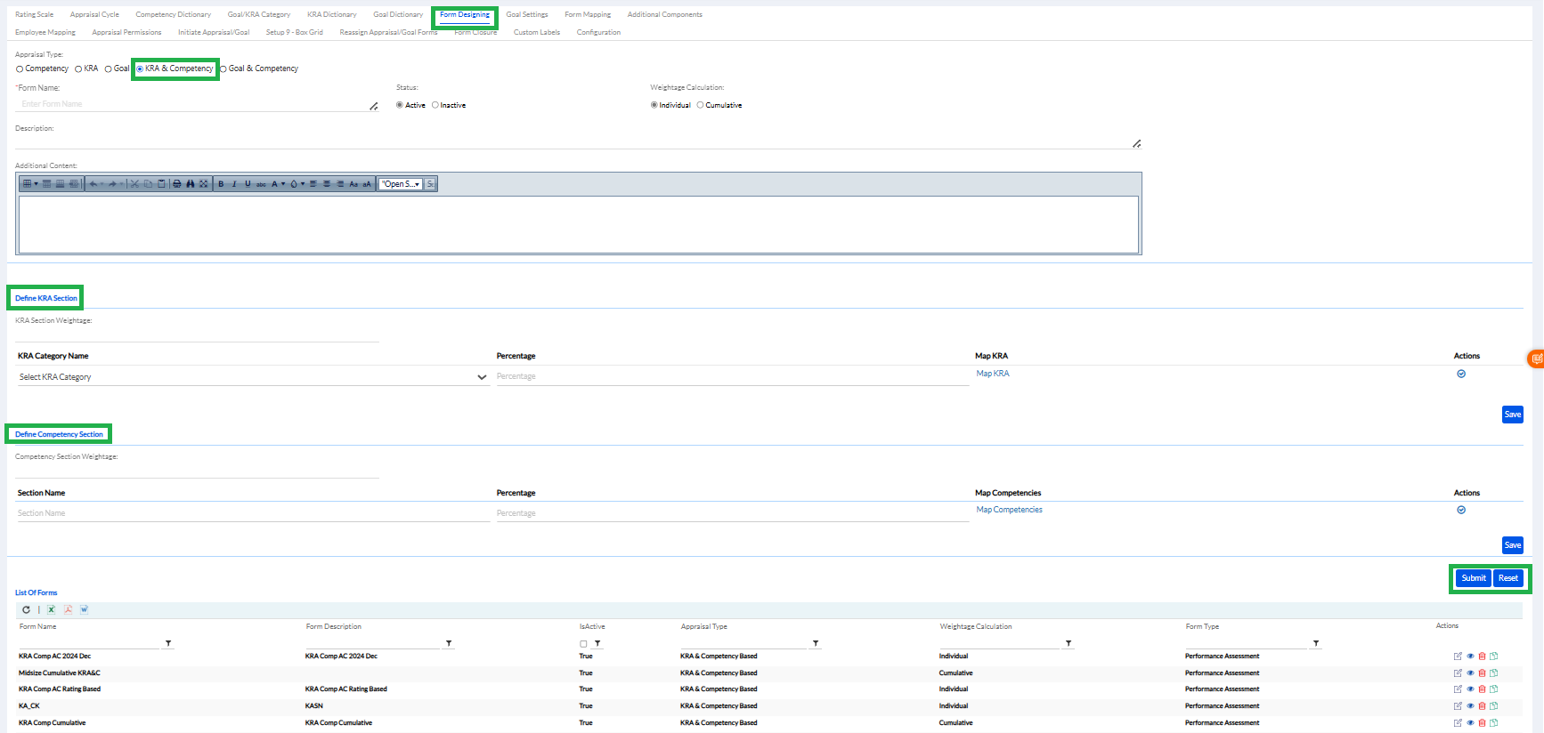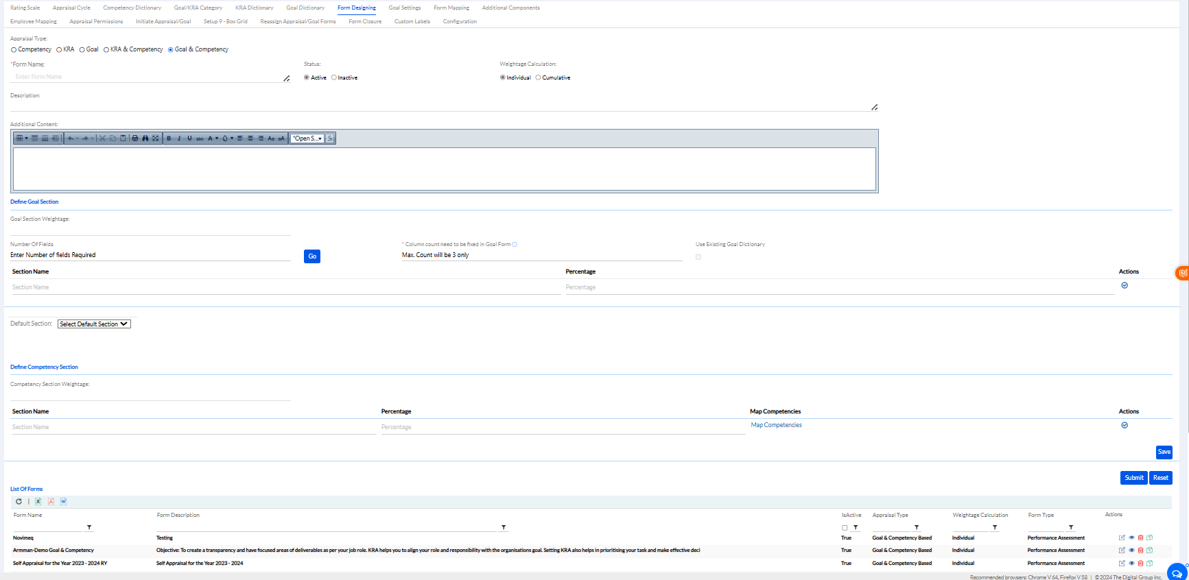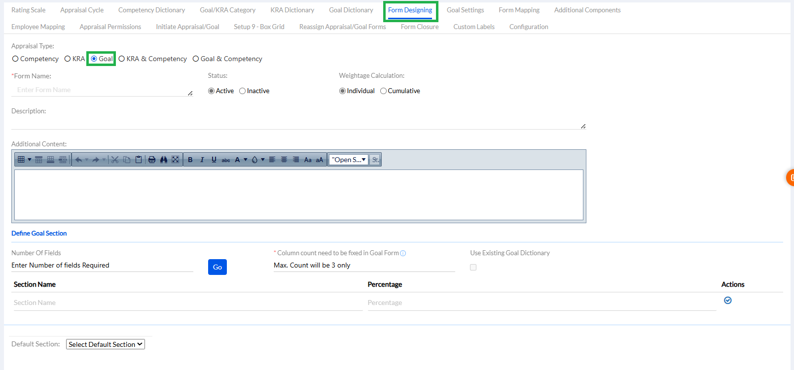 Admin can configure the type of form here depending on 5 types. Competency, KRA, Goal, KRA & Competency, and Goal& Competency.