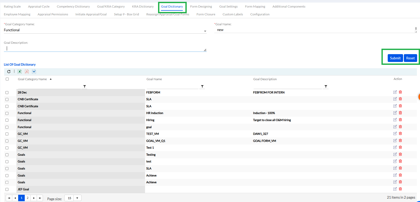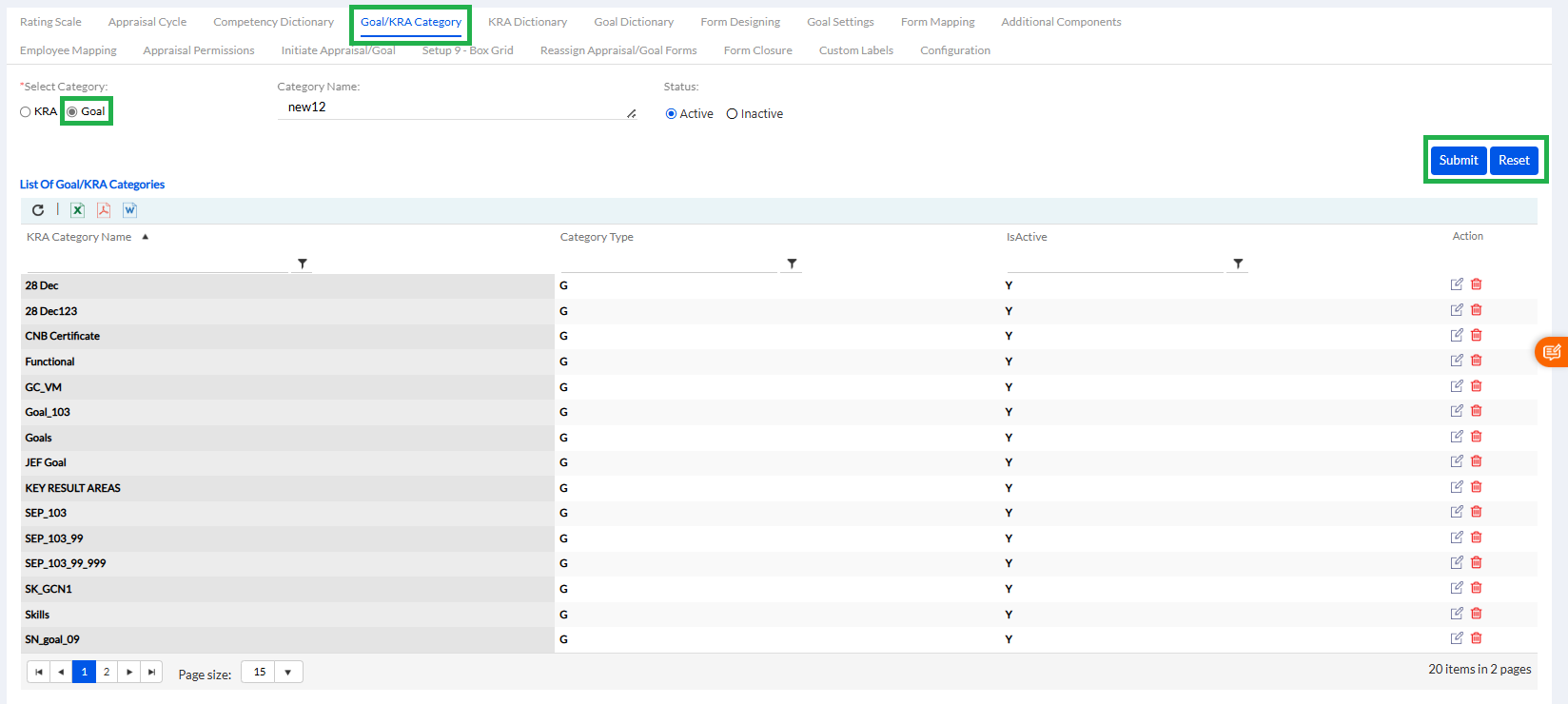 Click Submit (as highlighted in the above screen) to create a new Goal Category.