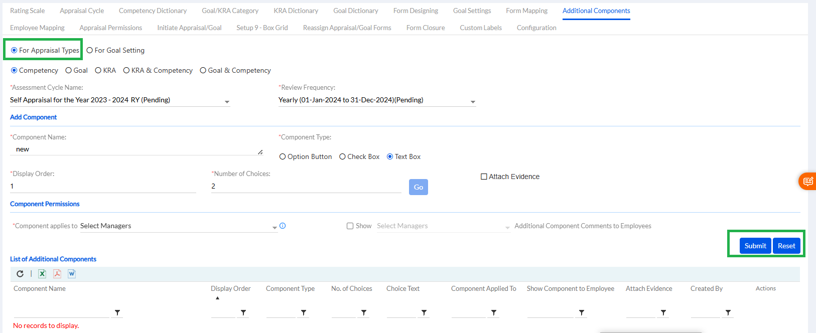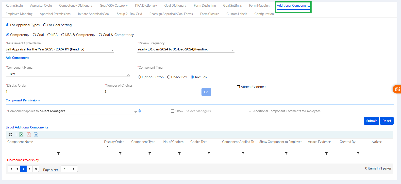 Add the details like selecting the Select Assessment Cycle Name, Component Name, and Component Type (Option Button, Check Box, Text Box), Display Order, Number of Choices to be given, Click the box Attach Evidence. Component Permissions section has option to select Component applies to from the dropdown, click on checkbox to Show (select manager level) and Submit.