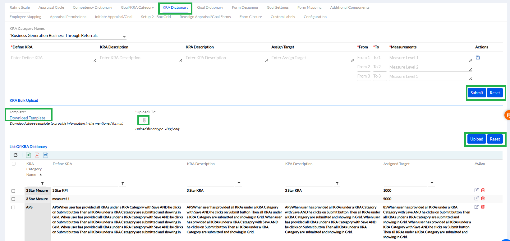 To create KRA Dictionary, Define KRA, KRA Description, KPA Description, Assign Target. Enter From, To and Measurements. Admin can Upload KRA Dictionary through Excel Template. Upload the filled-up file in template.