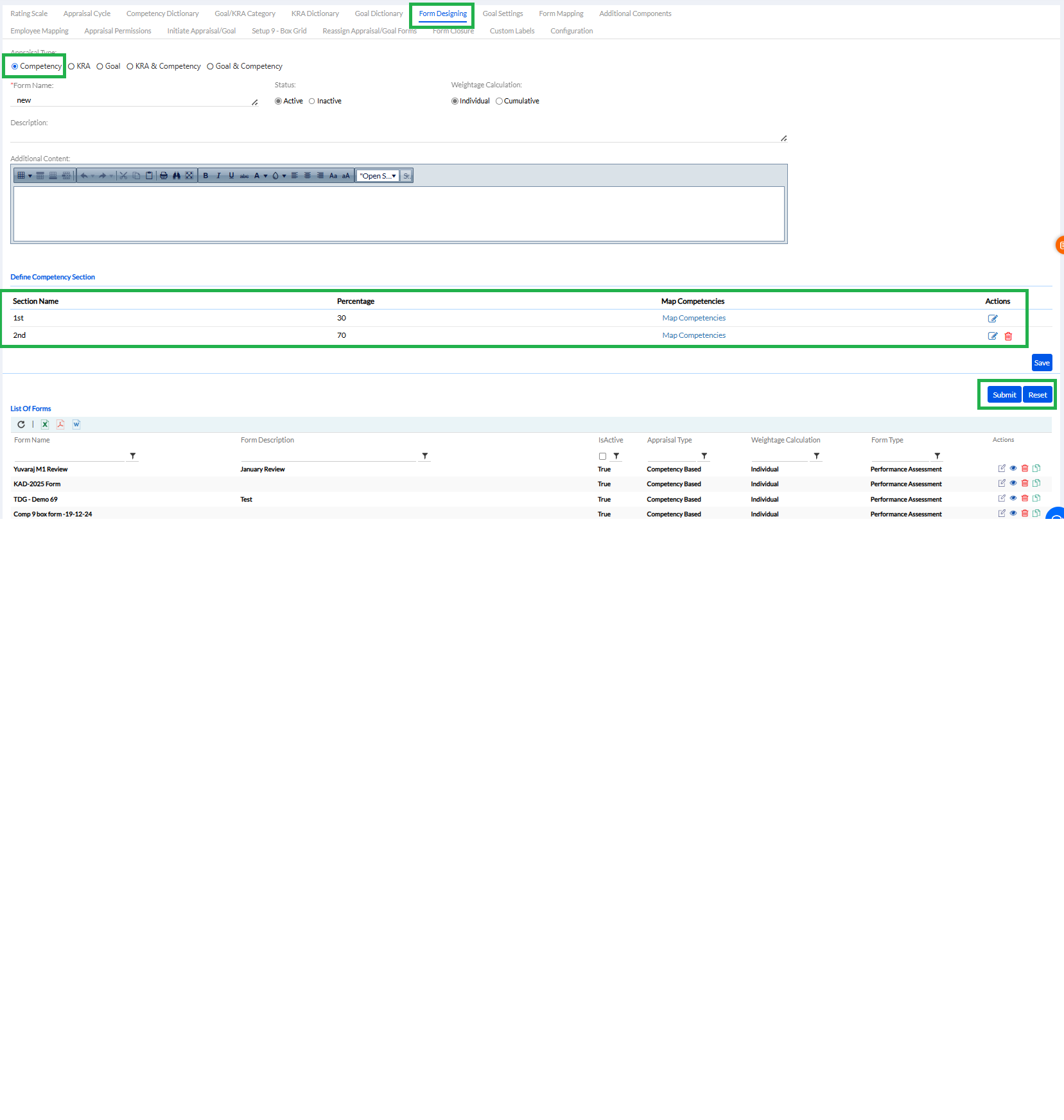 Click Submit (as highlighted in the above screen) to design a new Competency Form. Define Competency Section with section name, percentage (total should be 100), map competencies and actions (add/edit).