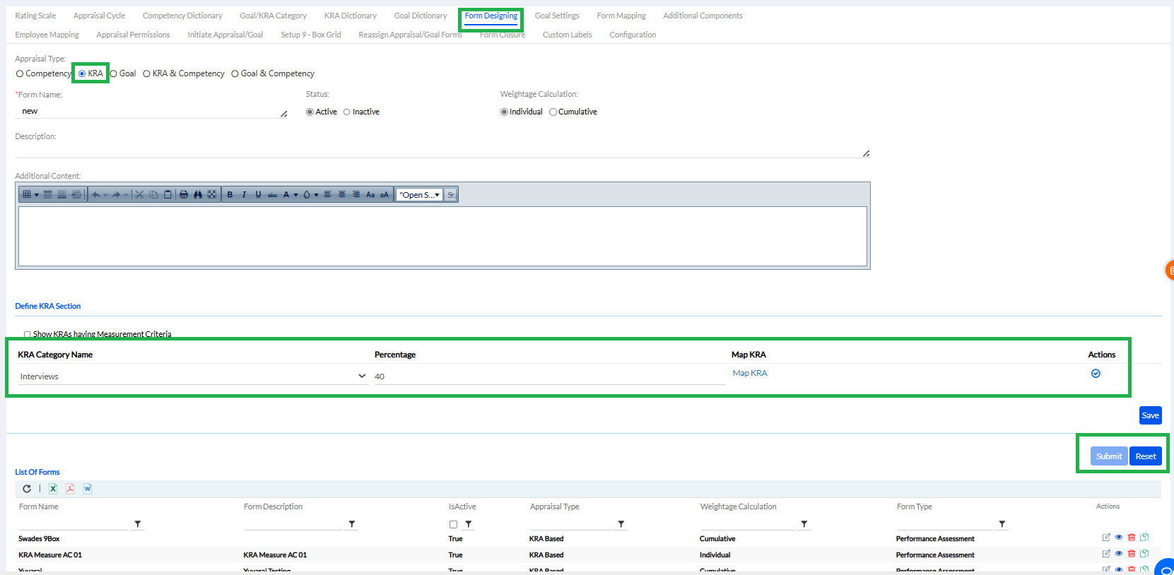 Click Submit (as highlighted in the above screen) to design a new KRA Form.