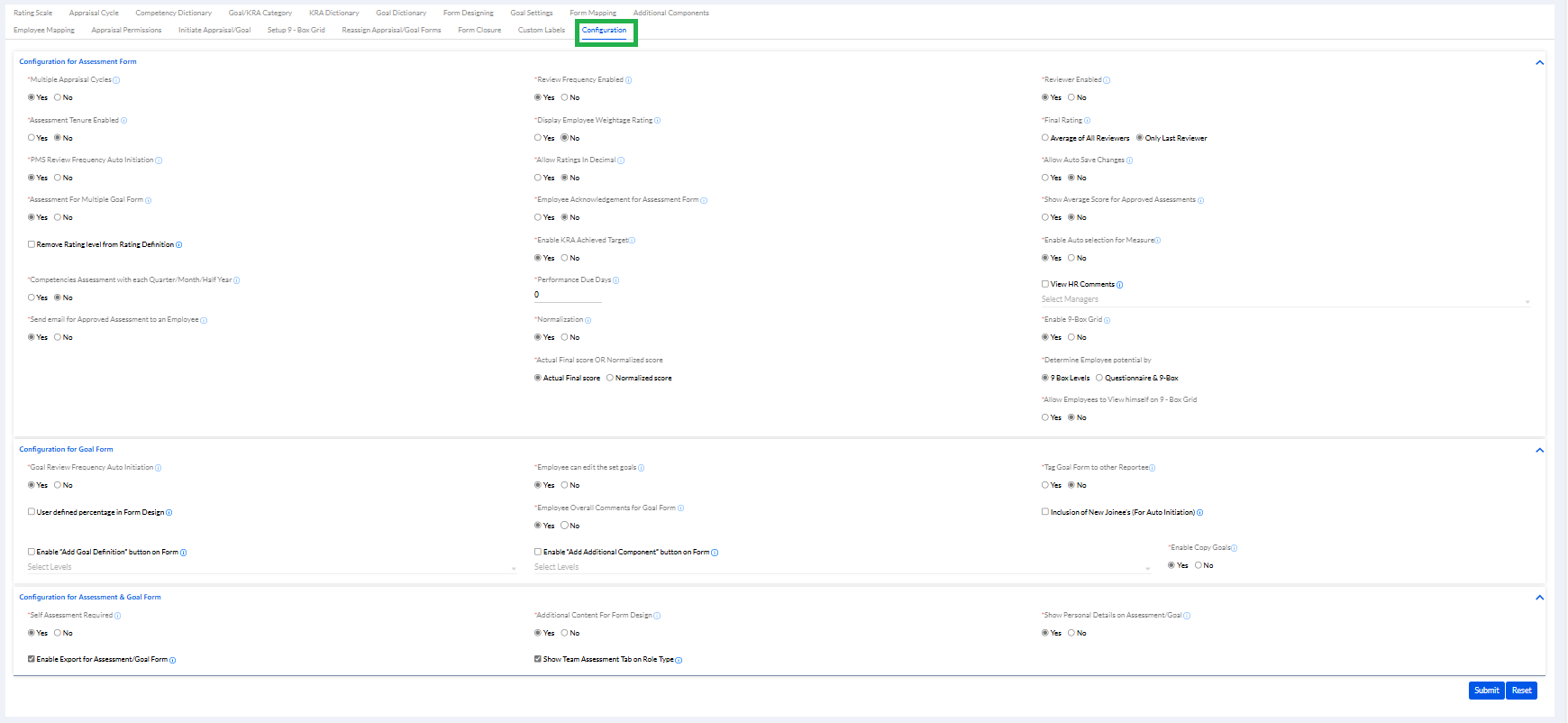 The Multiple Appraisal Cycle, Review Frequency Enabled, Calculate Save Changes, Reviewer Enabled, Assessment Tenure Enabled, Self Assessment Required, Display Employee Weightage Rating, Final Rating (Average of All Reviewers or Only Last Reviewer), Mapping For Appraisal, PMS Review Frequency Auto Initiation, Goal Review Frequency Auto Initiation, Employee can edit set goals, Actual final Score or Normalized Score, Additional Content For Form Design, Allow Ratings in Decimal, Notification For Goal Freeze, Performance Due Days, Allow Auto Save Changes, Employee Overall Comments For Goal Setting should be selected as per requirement of the project and company norms. There is option to enable View HR Comments and Inclusion of New Joinees (For Auto Initiation) if yes then select whether to consider from Date of Joining or Date of Confirmation.