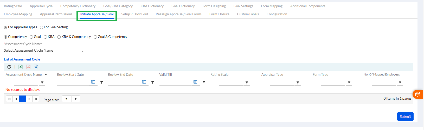Add the details like selecting the Select Assessment Cycle Name, and Submit.