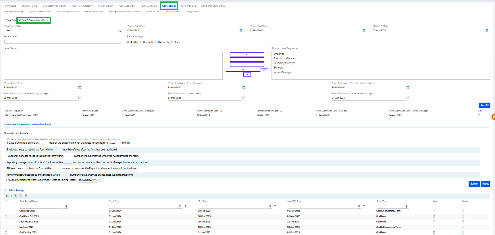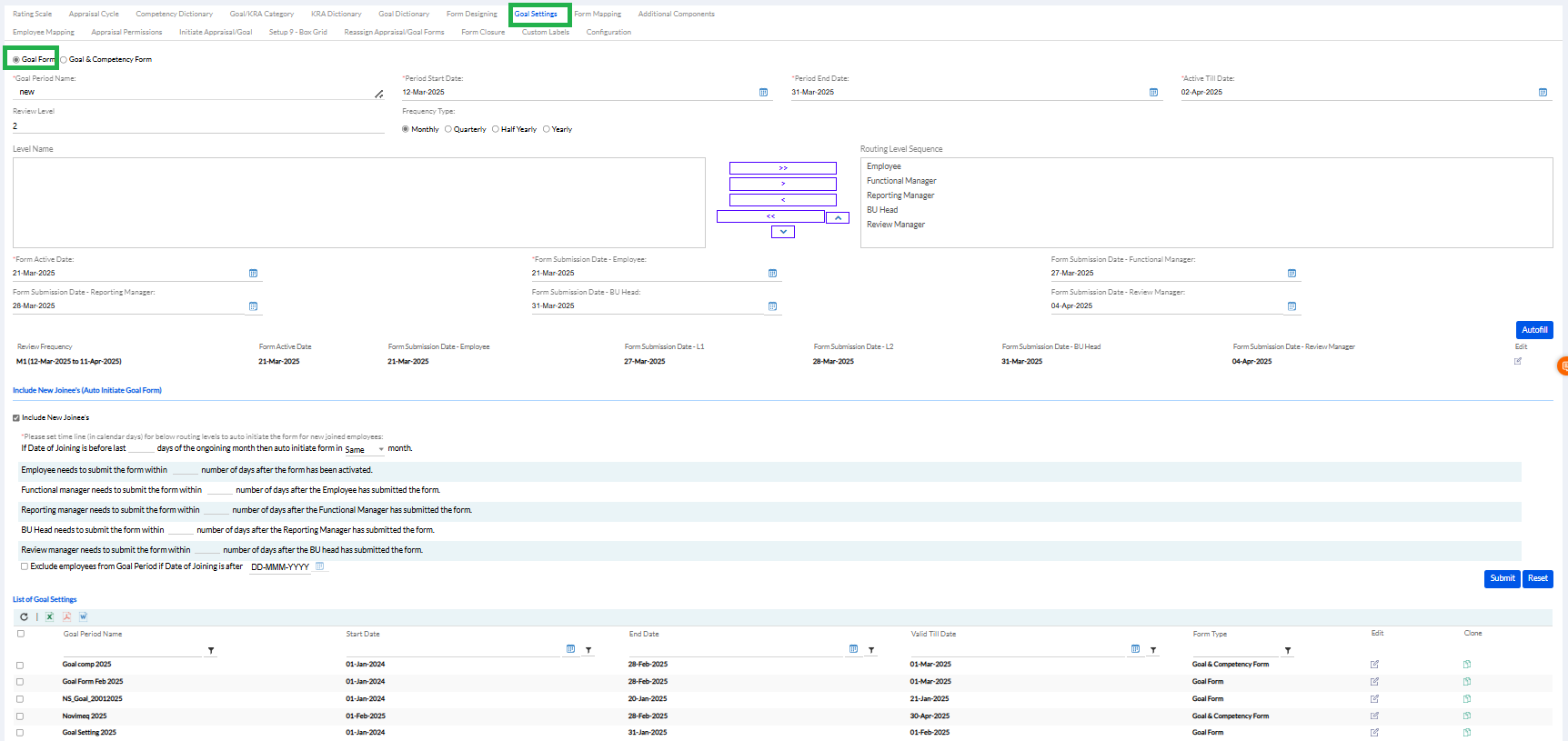 Fill in the Goal Period Name, Period Start Date, Period End Date, and Active Till Date. Review Level, and Frequency Type (Monthly, Quarterly, Half Yearly, and Yearly) Level Name, From Active Date, Form Submission Date (Employee, Functional Manager, BU Head, Review Manager) and Submit.