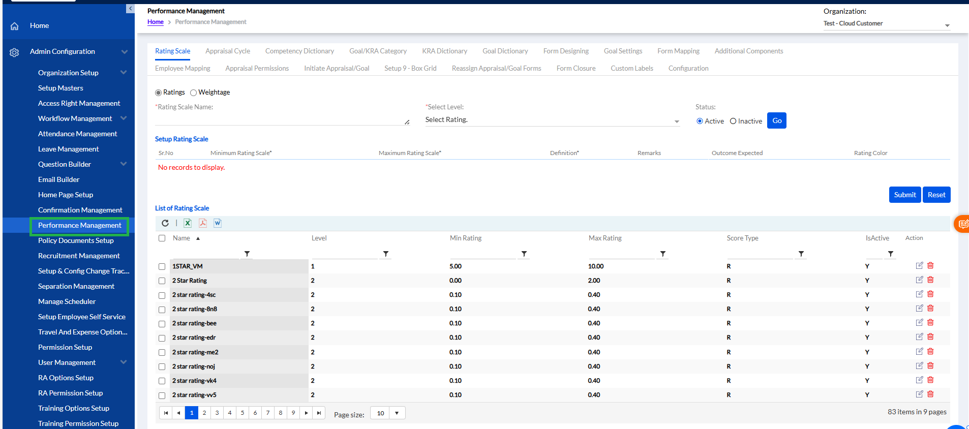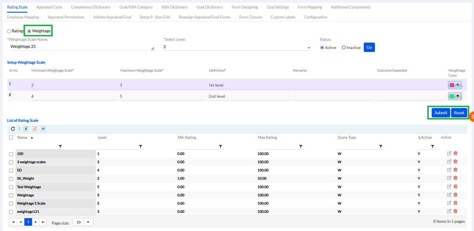The Weightage Rating Scale is fixed by the admin by filling the Rating Scale Name, Select Level, selecting the status Active/Inactive and press go.