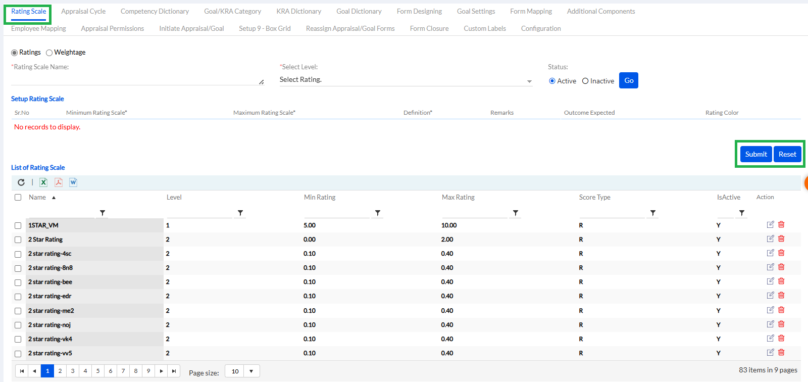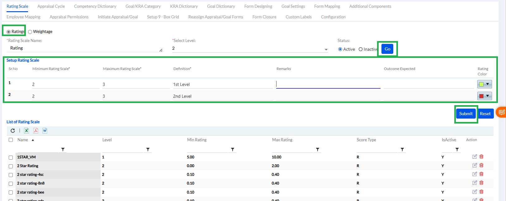 The Rating Scale is fixed by the admin by filling the Rating Scale Name, Select Level, selecting the status Active/Inactive and press go as shown below.