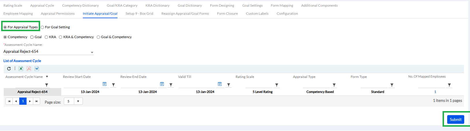 The user can initiate appraisal or goal by selecting For Appraisal Types or For Goal Setting respectively. After doing Form mapping and employee mapping, HR/Admin can initiate the cycle.