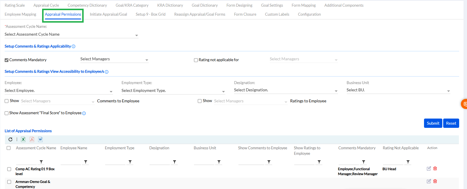 Appraisal permission is used by HR to control, who can provide comments and ratings on the form. And from this page, HR/Admin can provide access to employee for viewing the manager`s comments and final ratings.