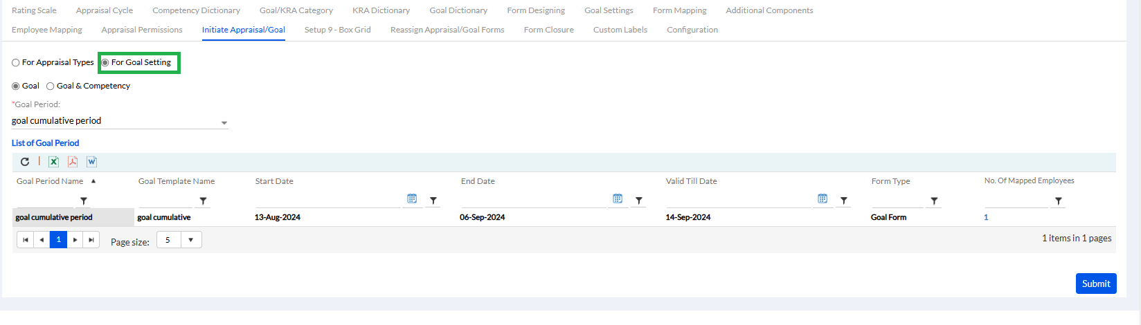 Click Submit (as highlighted in the above screen) to design a new Goal Form.