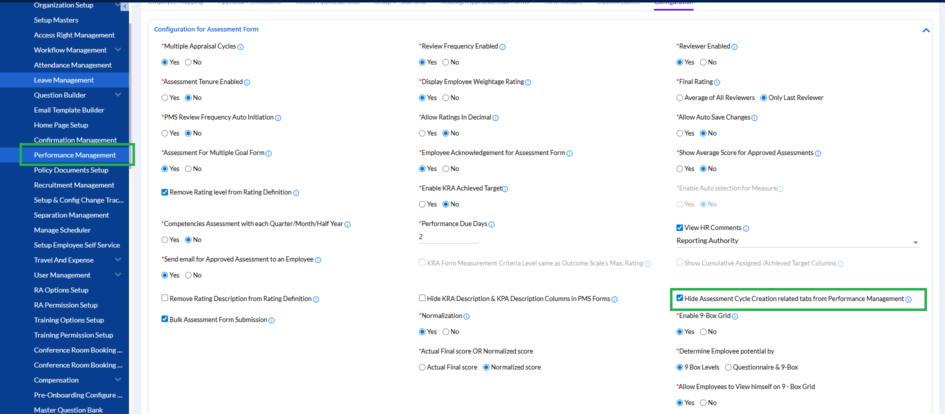 To avoid confusion in employee assessment creation, there is a feature called hide Assessment Cycle Creation Related tabs from Performance Management.