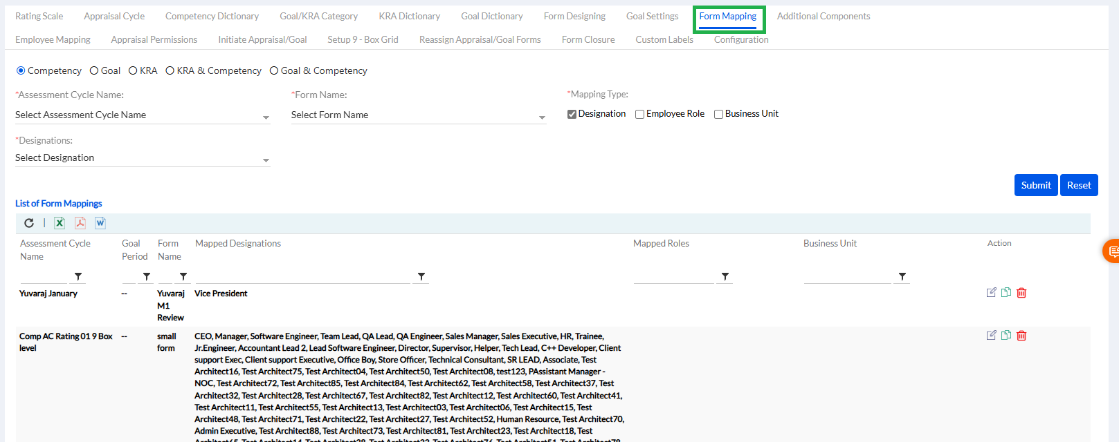 User can create multiple form mappings for an assessment cycle with different forms and unique mapping type. Once the forms are filled out they are mapped to the respective employees.