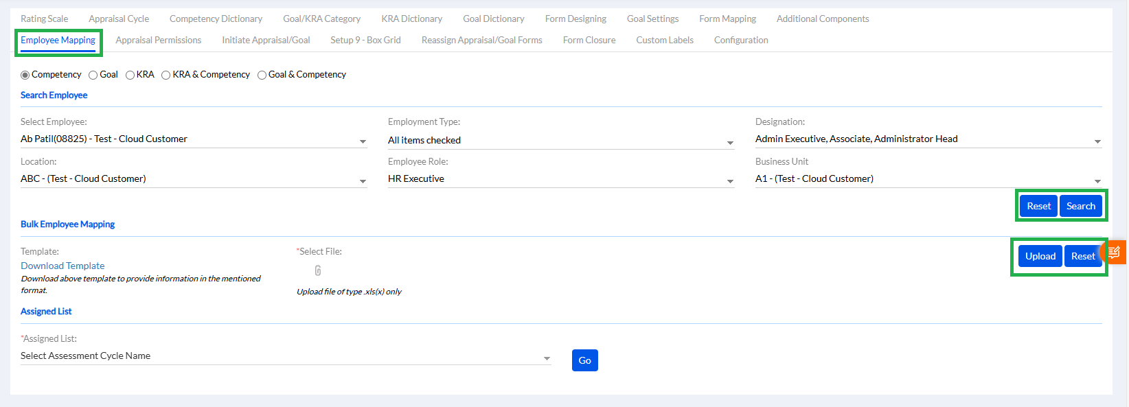 The user needs to select Employee, Employment Type, Designation, Location, and Business Unit and search. For deleting or viewing the mapped employees, user can go to assigned list and after selecting the assessment cycle, click on go. The list of employees will be displayed below, select the employee and click Assign Appraisal. Previously added Assigned are displayed in Assigned List.
