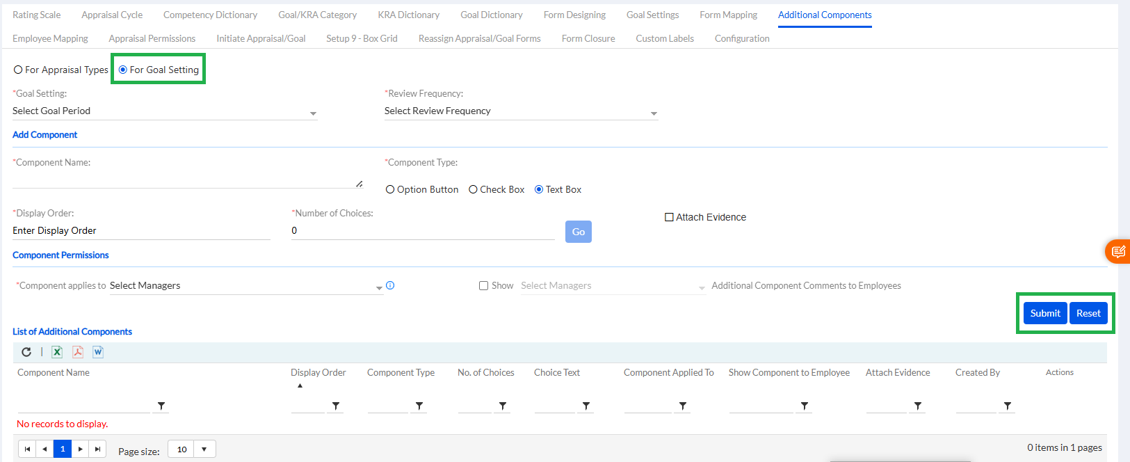 Fill in the Goal Setting by Select Goal Period, and Review Frequency type (Monthly, Quarterly, Half Yearly, and Yearly) Display Order, Number of Choices to be given, Click the box Attach Evidence. Component Permissions section has option to select Component applies to from the dropdown, click on checkbox to Show (select manager level) and Submit.