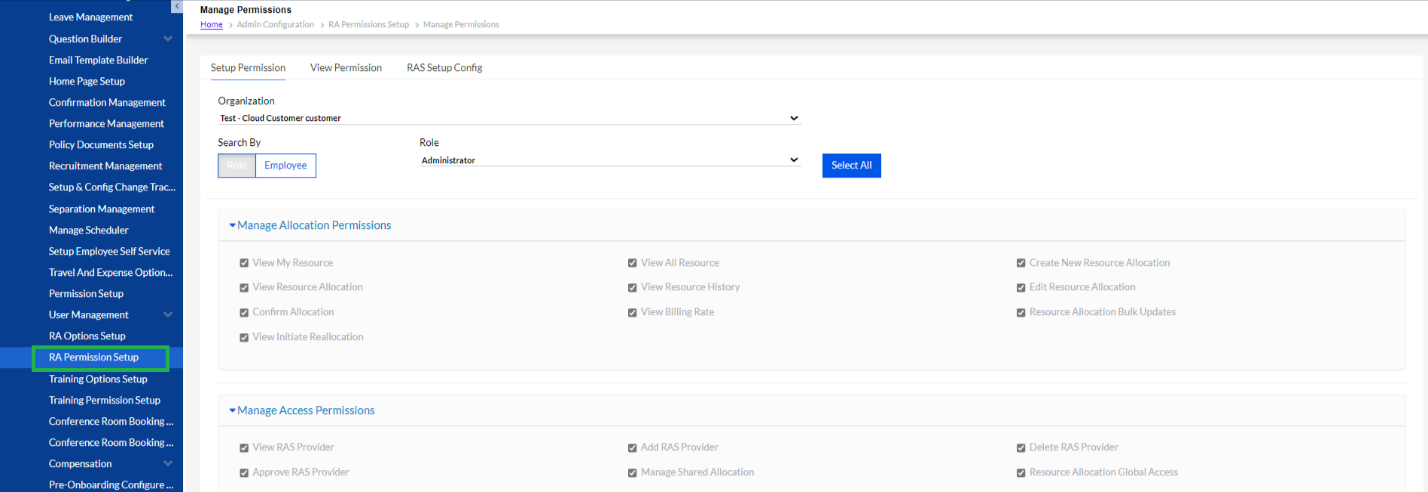 From the RA Permission Set up Admin users can give permission to Managers, HR or RAS providers or any person to whom Admin User wants to give access. The Permission is given according to Role or Employee. Please check the below screenshot for a better understanding.