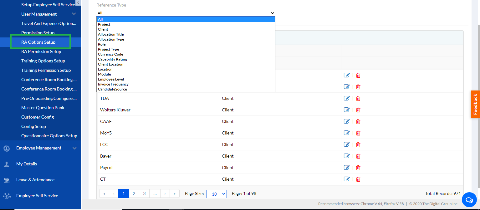 This is for Admin users. From RA option set up user can add Project, Client, Allocation Title, Allocation Type, Role, Project Type, Currency code, Capability Rating, Client Location, Location, Module, Invoice Frequency etc.