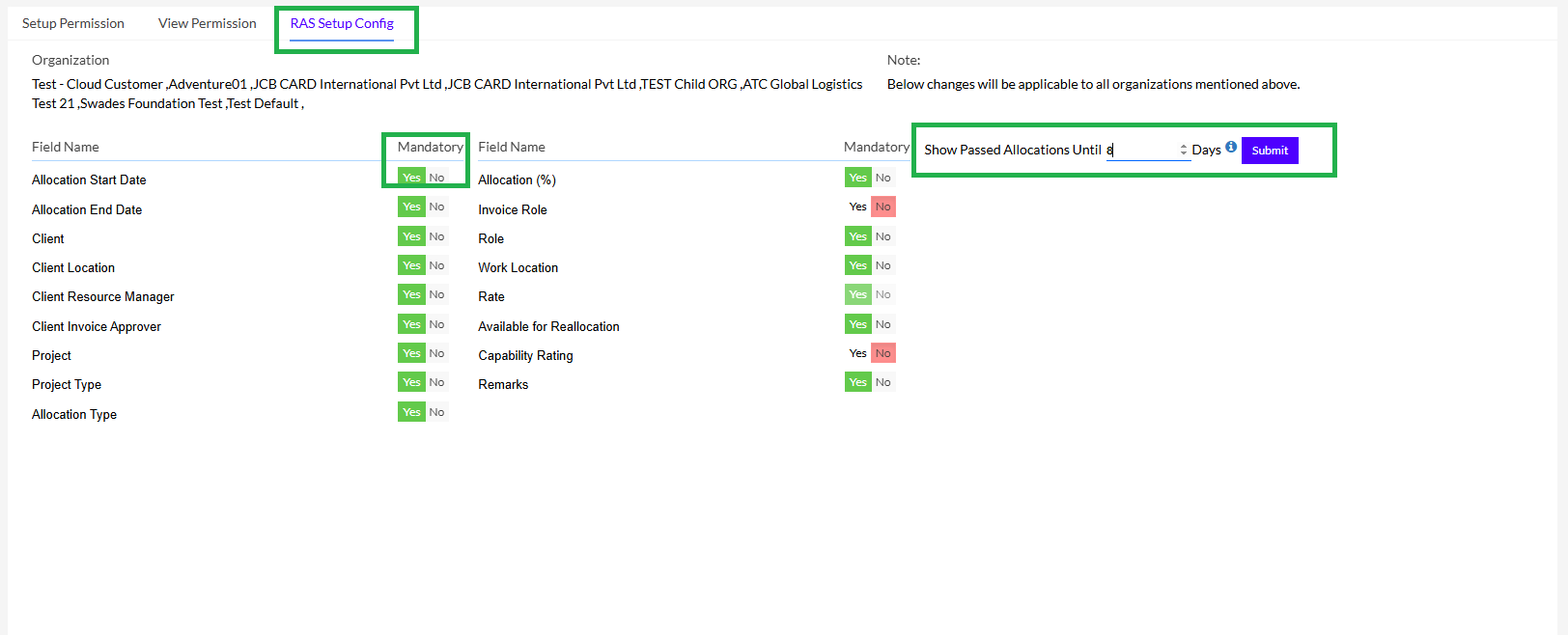 The Admin can change the Fields from Mandatory Yes or No to No or Yes as shown in the above screen simply clicking Yes or No, and then clicking on the Submit button to save. There is a feature to Show Passed Allocation, where the Admin can set the value in days and Submit.