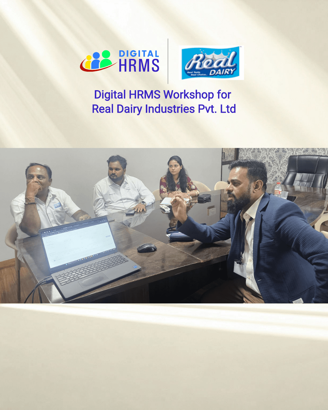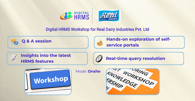 Digital HRMS successfully conducted an engaging and interactive HRMS workshop at Real Dairy Industries Pvt. Ltd. The workshop aimed at enhancing users' understanding and ensuring effective utilization of the Digital HRMS platform.