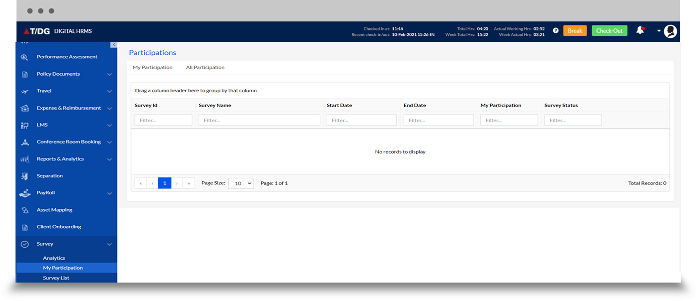 The My Participation tab is visible to all employees in the organization and it displays a list of surveys which the user has participated in. There are also details about each survey on the list, such as Start Date, End Date, Survey Status, etc.