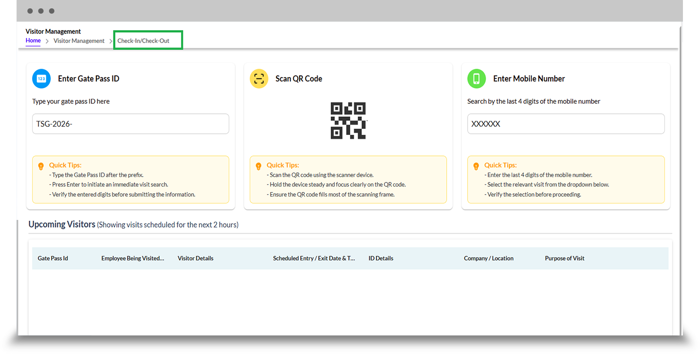 The Check-In/Check-Out module enables secure and efficient visitor management through QR code scanning, Gate Pass ID entry, or mobile number search with OTP verification. It provides real-time visibility of scheduled visits for better tracking. The system supports identity verification, visitor declarations, and photo capture during check-in. For group visits, bulk or individual processing is available, including partial check-ins and marking absentees as “No Show,” ensuring flexibility, accuracy, and streamlined visitor flow management.
