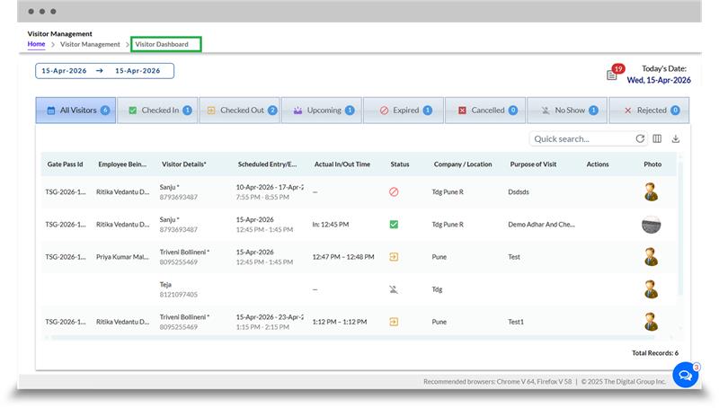 Visitor management is a holistic approach for greeting and keeping a check on both employees and guests on a company's property. Visitor sign-in is one part of the process, but it also involves invitation management, arrival alerts, safety procedures, access security, visitor monitoring, and compliance, all of which are customised to meet the organization's distinctive requirements. From advance registration and the manufacture of QR-based gate passes to check-in, checkout, and analytics, the Visitor Management System (VMS) on Digital HRMS optimises the whole visitor experience on a single platform. The need for contemporary, effective ways to control entrance for different kinds of visitors, including as clients, vendors, interviews, and impromptu guests, is highlighted by the inefficiency, errors, and security threats associated with traditional manual visitor management utilising paper registers.