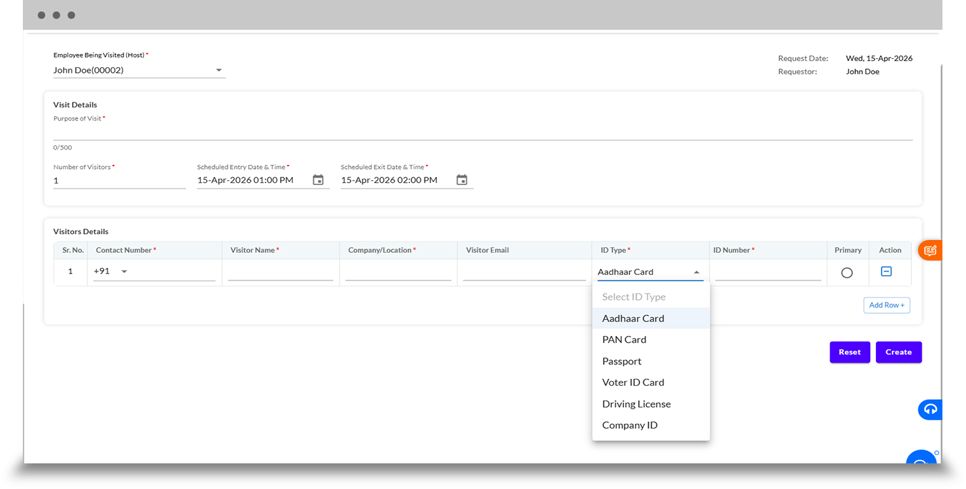 - Unplanned visitor self-registration via QR code displayed at reception or entry gates
